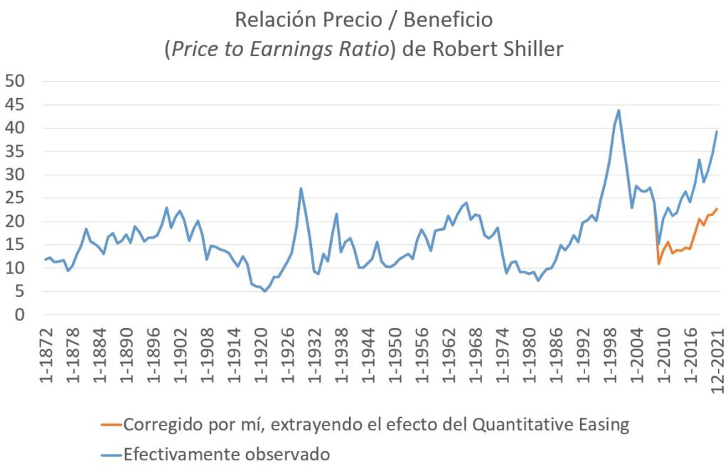 La línea naranja es una corrección hecha por mí. Básicamente, me apalanco sobre la norma histórica del 11% del ratio base monetaria sobre liquidez monetaria, para intentar extraer el efecto del Quantitative Easing; lo anterior, para dejar claro que la sobrevaluación bursátil se debe precisamente a esta política laxa, y que la caída de los mercados será importante una vez empiece la FED a subir los tipos de interés. Los inversores liquidarán posiciones en el mercado bursátil, de commodities y de criptoactivos y la FED responderá vendiendo gradualmente los bonos del Tesoro de EE.UU. que de largo plazo ha venido acumulado en los últimos 14 años, precisamente gracias al Quantitative Easing .