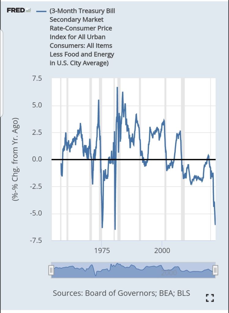 Gráfico Nro. 1: Diferencia entre el tipo de interés del mercado secundario de Letras del Tesoro de los EE.UU. a 3 meses y la inflación del IPC