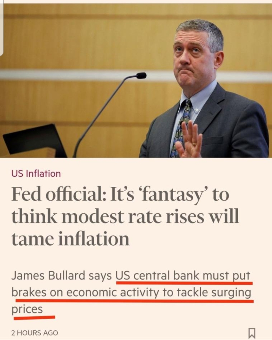 Cuando James Bullard, Presidente de la FED de St. Louis, declara en los términos de arriba (“…es una ‘fantasía’ pensar que los aumentos modestos de los tipos [de interés] controlarán la inflación… la FED debe frenar la actividad económica para hacer frente al aumento de los precios”), créanme, ha sido en total coordinación con el Comité de Política Monetaria de la Reserva Federal. Y está claro que, pisarán frenos lo necesario para recuperar el control sobre la tasa de inflación, tal y como pronosticamos acá con base a la misma Teoría de la Inconsistencia Dinámica de la Política Monetaria.