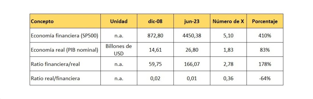 Este análisis se basa en datos concretos: desde diciembre de 2008 hasta junio de 2023, observamos los avances acumulados de la economía real y financiera. Los resultados son notables: mientras que la economía financiera ha experimentado un retorno impresionante de 5,10X o un 410%, impulsada por el Quantitative Easing y la política monetaria expansiva, la economía real ha crecido solo 1,83X o un 83%. Esto significa que la economía financiera avanzó a una velocidad 2,78 veces la de la economía real, que avanzó a una velocidad equivalente al 36% de la financiera (véase la Tabla Nro. 1 y los Gráficos Nro. 1 y 2).